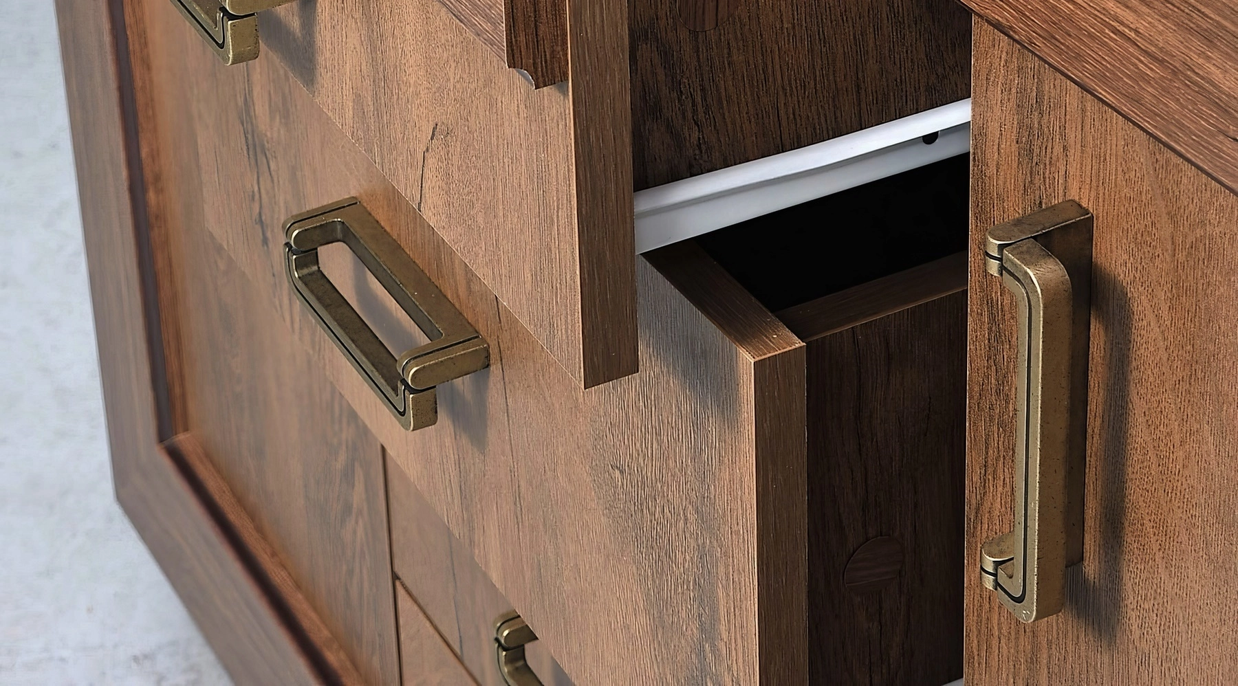 Bar má 2 prosklená dvířka, 3 praktické zásuvky a 1 výklopná dvířka.