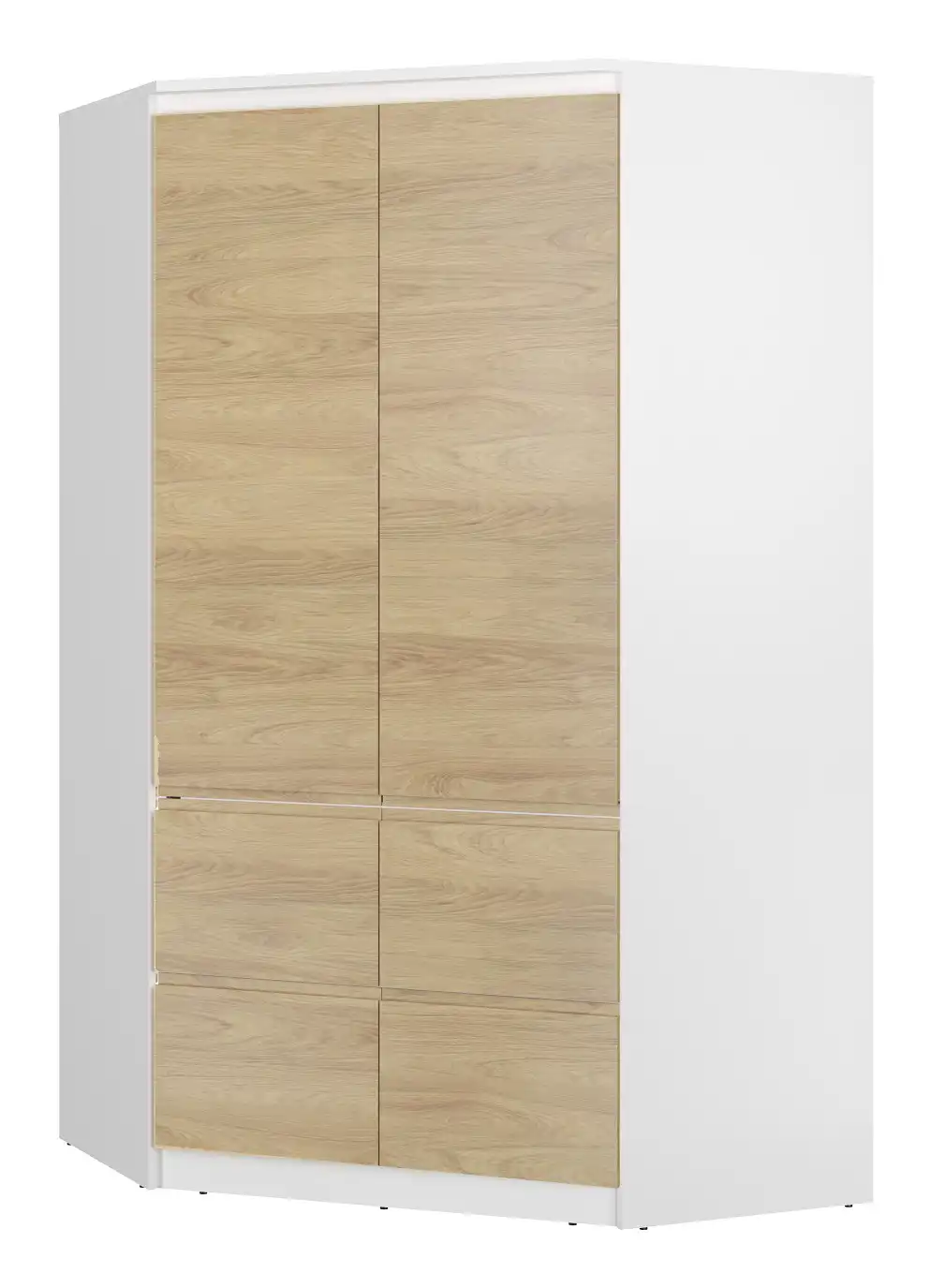 Rohová skříňBarva: alpská bílá/dub hikoraMateriál: lamino/MDFRozměry (šxvxh): 120,9 x 213 x 120,9 cmDodáváno v demontu.