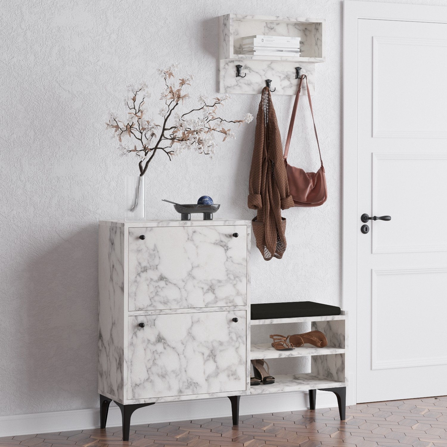 Tento botník s elegantním designem a povrchovou úpravou z mramoru carrara je stylovým doplňkem každé předsíně nebo chodby. Závěsný věšák poskytuje další úložný prostor pro bundy, šály a klobouky a udržuje váš prostor uklizený a organizovaný.