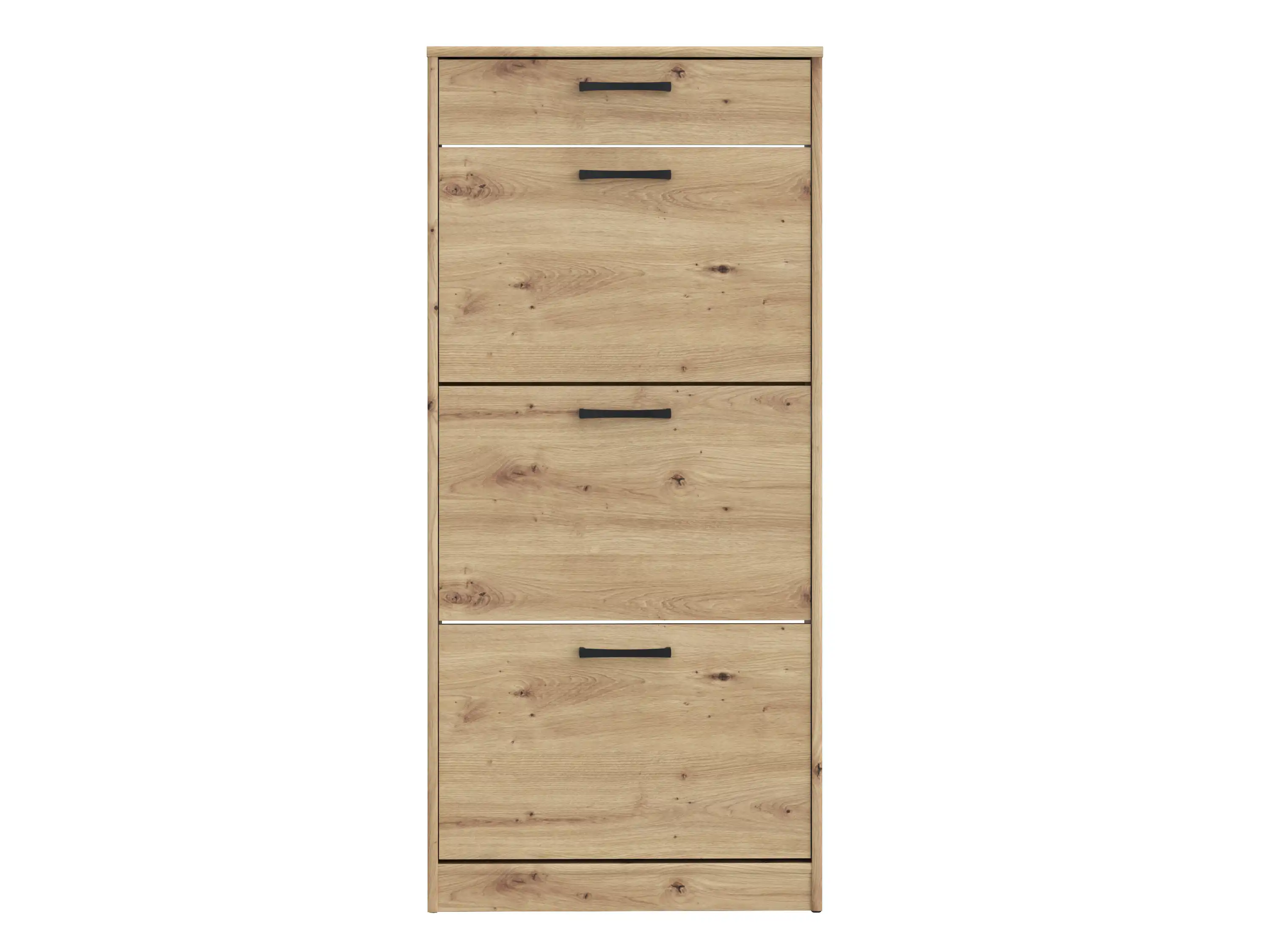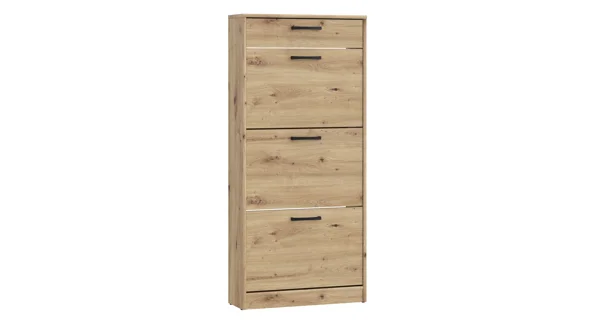 Výklopný botník se zásuvkou Rozměry (šířka x výška x hloubka): 58,2 x 127,7 x 20,4 cm Materiál: lamino, úchyt - plast Barva: dub artisan Dodáváno v demontu.