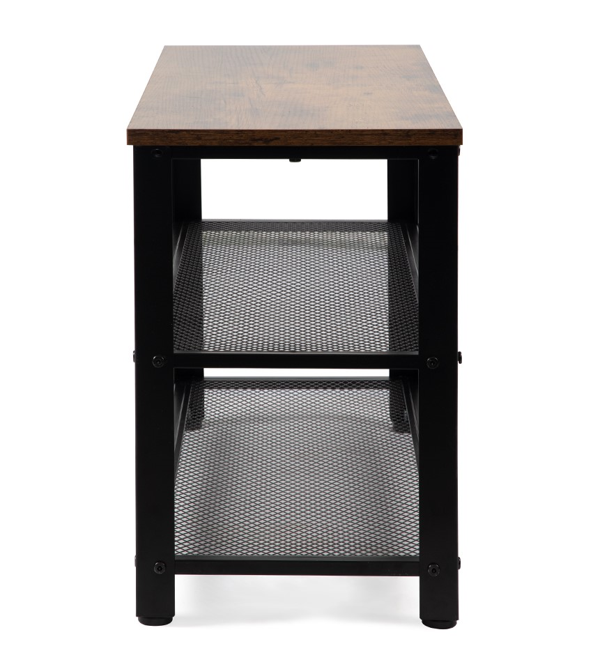 Botník s robustní kovovou konstrukcí a odolnou deskou. Dvě prostorné mřížkové police pro uložení obuvi a doplňků. Vrchní část lze využít jako odkládací plochu nebo lavici na sezení. Stabilní a vzdušný design vhodný do předsíně či chodby. Kombinuje praktické řešení s moderním industriálním stylem.