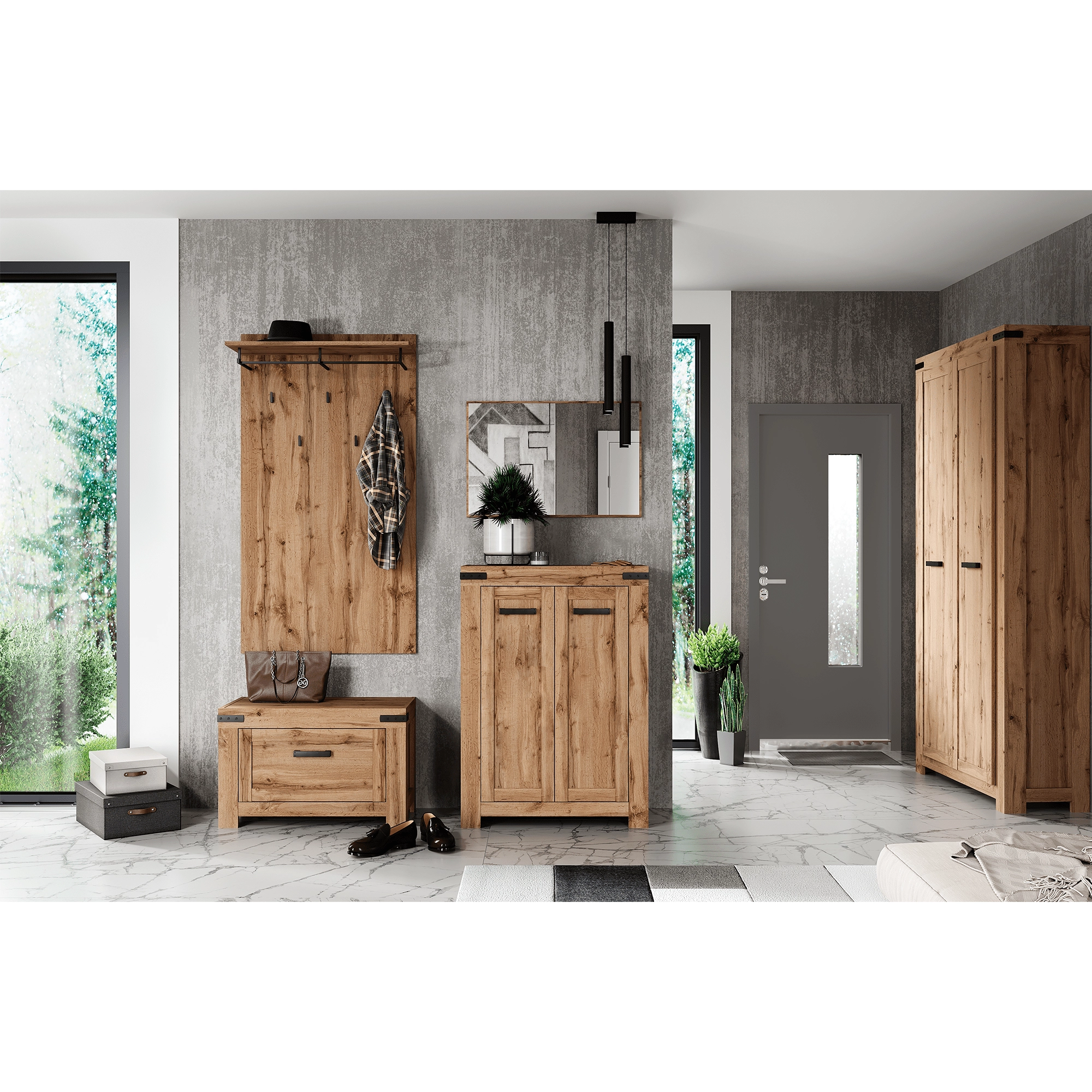 Botník s výklopem ze sektorové řady.Barva: dub wotanMateriál: laminovaná dřevotříska/dvířka z MDFÚchyt: plastRozměry (šxvxh): 80 x 51,4 x 40,1 cmVýška nožek je 7 cmDodáváno v demontu.