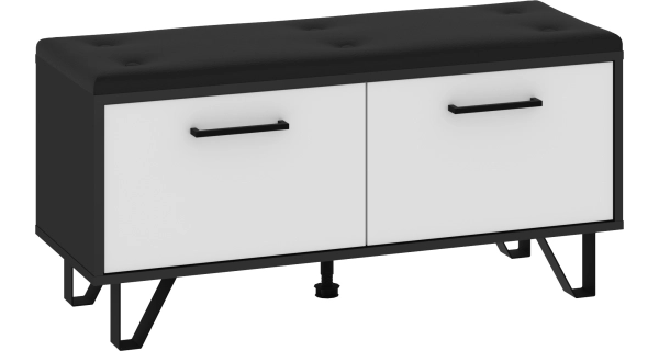 Policový botník s výklopnými dvířky a sedákem Barva: - černá/bílý lesk - nožky, úchytky a sedák: černá Rozměr (šxvxh): 100 x 48 x 39 cm Výška nožek: 12 cm Materiál: - lamino 16 mm, ABS hrany - sedák: ekokůže - nožky: kov Nosnost: max. 80 kg Disponuje systémem tichého dovírání.