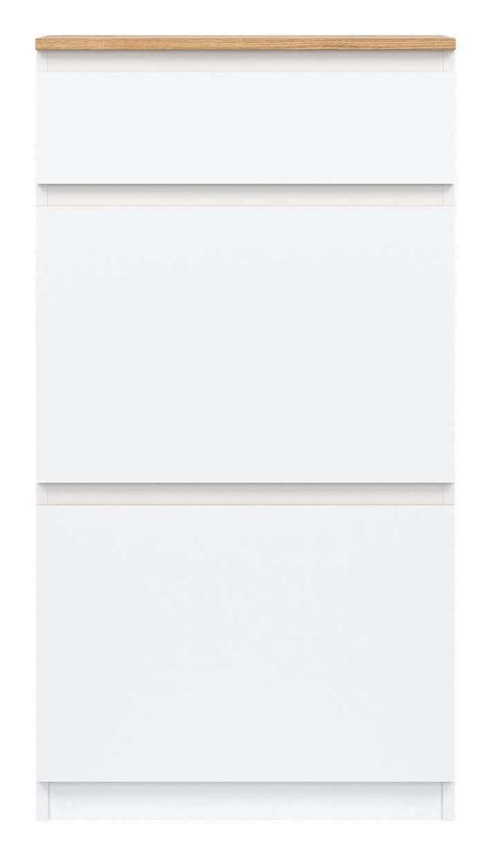Výklopný botník se zásuvkou ze sektorové řady.Barva: bílá/dub evokeMateriál: laminoRozměry (šxvxh): 60 x 113 x 30 cmDodáváno v demontu.
