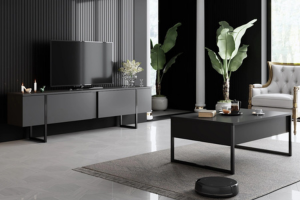 Obývák: TV stěna, komody a konferenční stolky dodají místnosti řád a vizuální kotvu.