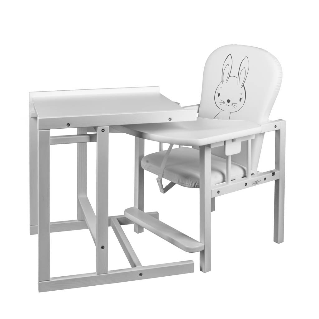 Borovicová židlička bílá Multifunkční židlička české značky je vyrobena z kvalitního borovicového dřeva a zdobí ji veselý obrázek králíčka. Jídelní židličku lze rozložit a použít jako samostatný stůl se židličkou, což lze využít také během zábavy. Sedací část je pokryta barevným lehce omyvatelným materiálem, vyplněným molitanem, díky čemuž je židlička velice pohodlná. Veškeré materiály a suroviny používané při výrobě mají potřebné atesty nebo certifikáty, a proto je nábytek značky zcela bezpečný a odolný.