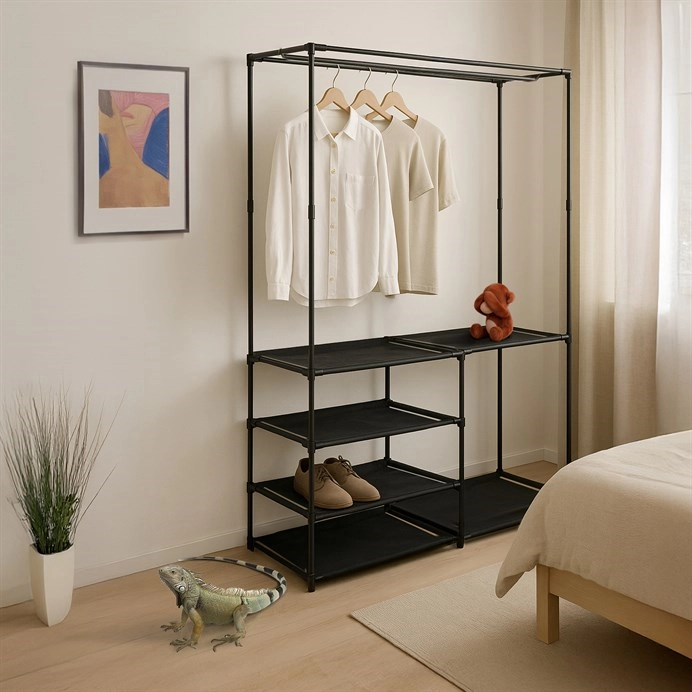 Moderní stojan na šaty spojuje praktičnost s elegantním designem. Stabilní černá kovová konstrukce nabízí nejen prostor pro zavěšení oděvů, ale také čtyři police pro uložení krabic, bot nebo doplňků.