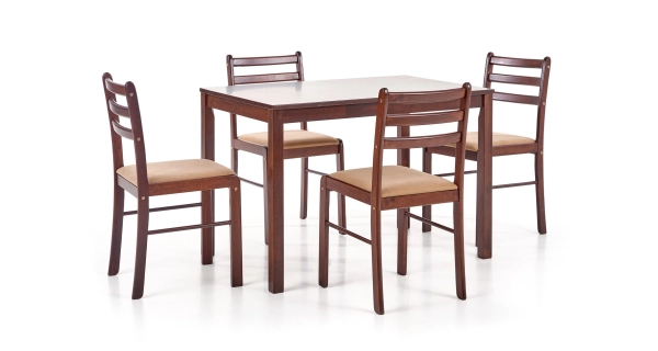 Set zahrnuje jídelní stůl a čtyři jídelní židle. Kostra stolu je vyrobená z pevného masivu (kaučuk), zatímco deska je z