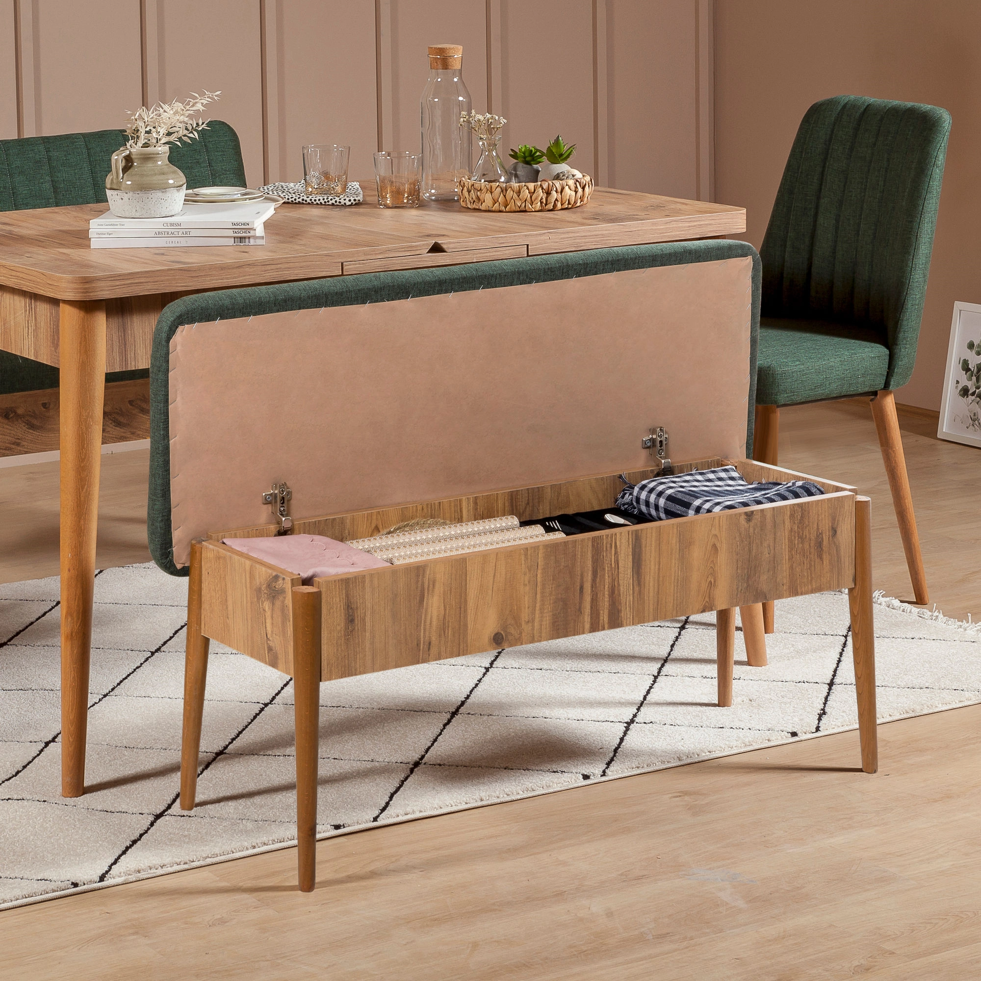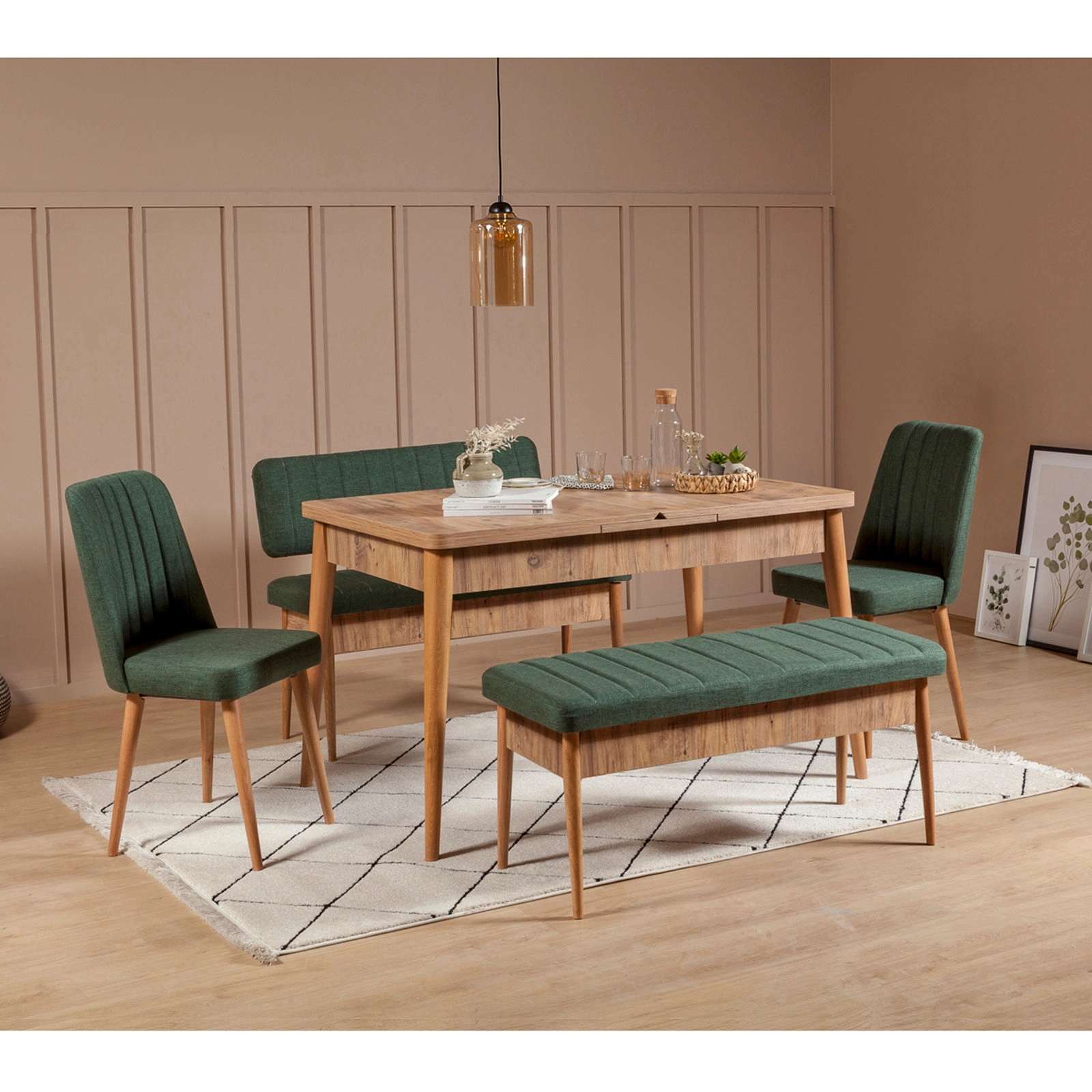 Rozkládací jídelní stůl vám umožní snadno pojmout další hosty, takže je ideální pro pořádání večeří nebo rodinných sešlostí. Nohy z habrového dřeva poskytují stabilitu a oporu a zajišťují bezpečné a pohodlné stolování. Součástí sady jsou také dvě židle, lavice a úložná jednotka, které nabízejí dostatek míst k sezení a úložných možností.