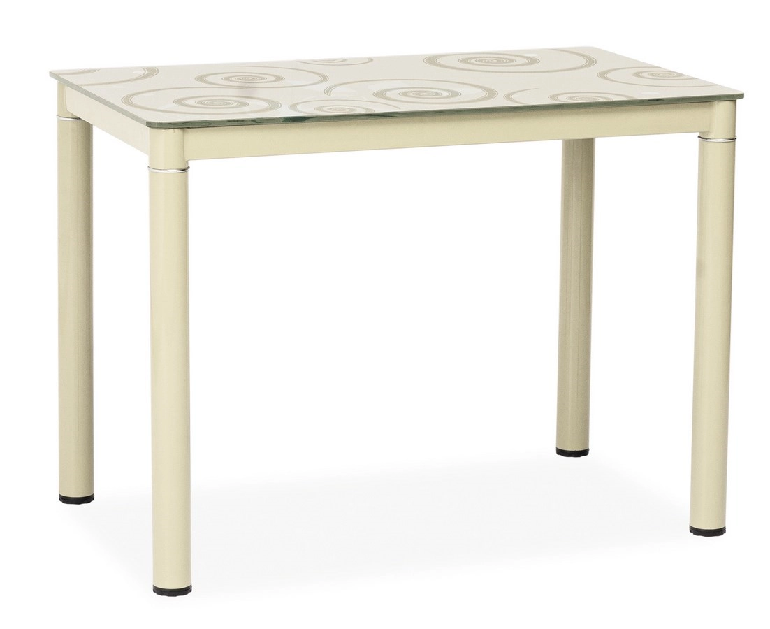 Moderní jídelní stůl v elegantním a praktickém provedení. Nohy stolu jsou vyrobeny z kovu, lakované bílou krémovou barvou, deska je z tvrzeného skla rovněž v bílé krémové barvě. Na desce stolu jsou jemné,