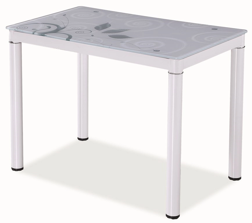 Jídelní stůlModerní jídelní stůl v elegantním a praktickém provedení. Nohy stolu jsou vyrobeny z kovu, lakované bílou barvou, deska je z tvrzeného skla v bílé barvě. Na desce stolu jsou jemné, velmi elegantní