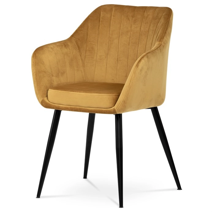 Dokonalý design, industriální styl a perfektní pohodlí je pro tuto židle samozřejmostí. Skořepina sedáku i opěradla má pevnou kovovou kostru, potah z velmi kvalitní sametové látky v matném provedení velmi žádaného odstínu hořčicově žluté. Polstrování je z PU pěny. Bonusem ke zvýšení pohodlí posedu je 8 cm zvýšený a extra polstrovaný sedák a praktické pohodlné opěrky s opěrnou plochou ve výšce 69 cm od podlahy. Příjemný dekorativní prvek vytvářejí svislá prošití vnitřních částí opěradla i boků. Použitá látka je velmi odolná a perfektně se čistí.