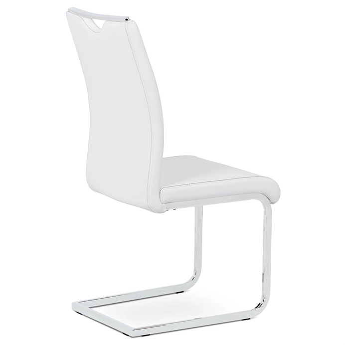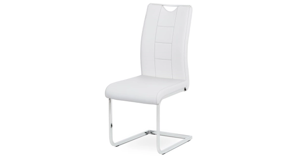 Jídelní židle, bílá koženka/chrom Atraktivní židle bude ozdobou každé jídelny či kuchyně. Provedení koženka v bílé barvě s dekorativním prošitím v kombinaci s pochromovaným madlem a podnoží. Praktické madlo zajistí snadnou manipulaci. Nosnost židle je do 110 kg. Barva: bílá Rozměr (šířka x hloubka x výška): 45 x 58 x 99 cm Šířka sedu: 45 cm Hloubka sedu: 46 cm Výška sedu: 46 cm Dodáváno v demontu, záruka 24 měsíců.
