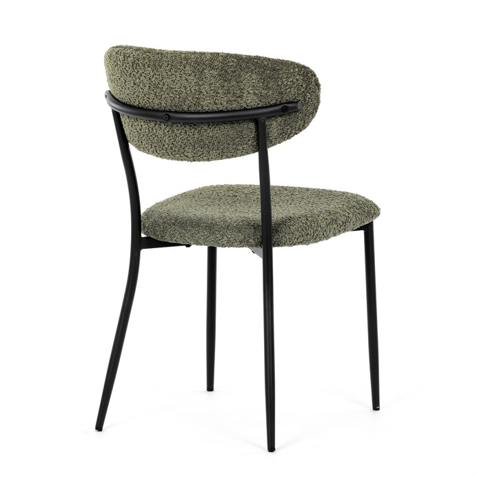 Čalounění z příjemné látky Bouclé dodává židli moderní a zároveň útulný vzhled, který skvěle zapadne do industriálních interiérů. Stabilní černé kovové nohy zajišťují pevnost a odolnost.