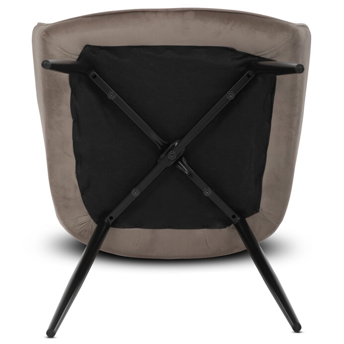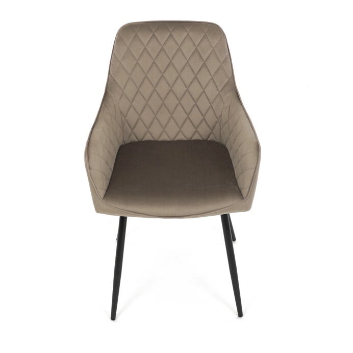 Jídelní židle se sametovým potahem v barvě cappuccina nabízí pohodlné sezení díky měkkému čalounění a ergonomicky tvarovaným područkám. Čalounění je doplněno designovým prošitím v kosočtverečkovém vzoru, které zvýrazňuje její moderní vzhled. Pevné kovové nohy v černém matném provedení zajišťují stabilitu a dlouhou životnost židle. Sametová látka je příjemná na dotek a snadno se udržuje, což ji předurčuje k použití v jídelnách i dalších obytných prostorách. Židle není otočná, což přispívá k její jednoduché a pevné konstrukci.