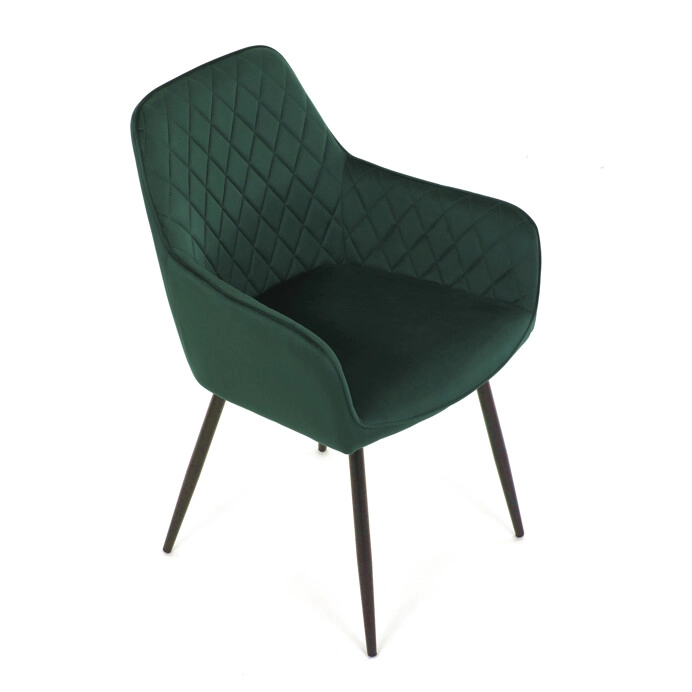Jídelní židle se zeleným sametovým potahem nabízí pohodlné sezení díky měkkému čalounění a ergonomicky tvarovaným područkám. Čalounění je doplněno designovým prošitím v kosočtverečkovém vzoru, které zvýrazňuje její moderní vzhled. Pevné kovové nohy v černém matném provedení zajišťují stabilitu a dlouhou životnost židle. Sametová látka je příjemná na dotek a snadno se udržuje, což ji předurčuje k použití v jídelnách i dalších obytných prostorách. Židle není otočná, což přispívá k její jednoduché a pevné konstrukci.
