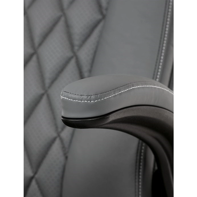 Čalounění z hladké šedé ekokůže působí profesionálně a snadno zapadne do jakéhokoliv kancelářského prostředí.