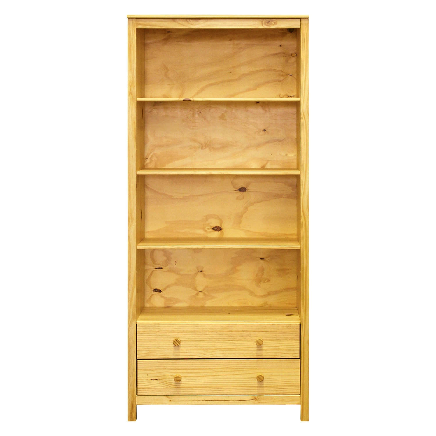 Knihovna z masivní borovice. Rozměr (šxvxh): 85 x 190 x 37 cm Materiál: masiv borovice lakovaná - 3 police - 2 zásuvky s kovovými pojezdy Dodáváno v demontu.