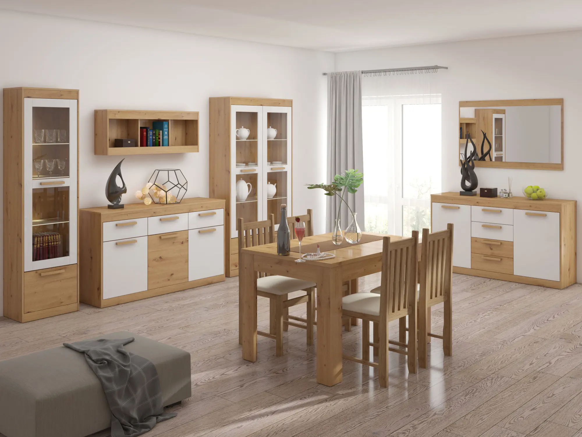 Kombinovaná komoda s dvířky a zásuvkami Barva: dub artisan/bílý lesk Rozměr (šxvxh): 148 x 85 x 44 cm Materiál: LTD, ABS hrany Tiché zavírání. Dodáváno v demontu.