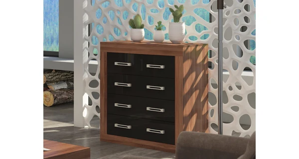 Komoda se čtyřmi zásuvkami Barva: švestka wallis (korpus)/černý lesk (dvířka) Materiál: lamino 16 mm Rozměry (šxvxhl): 80 x 89 x 44 cm Dodává se v demontu.