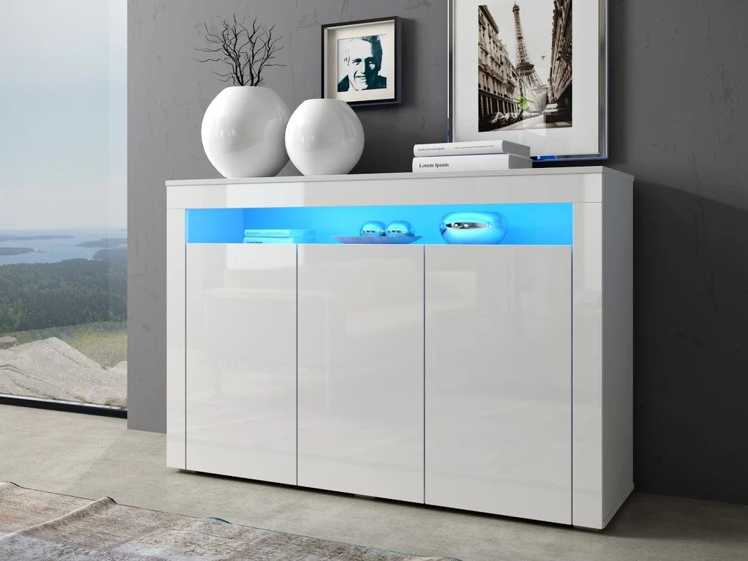 Třídveřová komoda Barva: bílá/bílý lesk Rozměry (šxvxh): 130 x 88 x 40 cm Materiál: LTD 16 mm LED osvětlení není v ceně. Dodání v demontu.