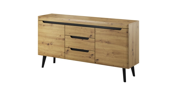 Široká kombinovaná komoda na nožičkách. Komoda obsahuje 2 police a 3 zásuvky (kuličkové ložisko H30 plný výsuv).