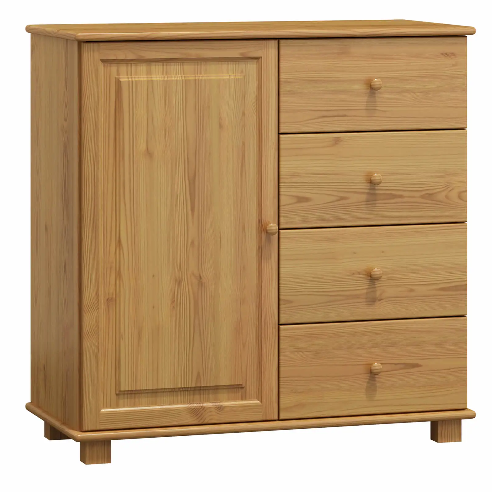 Komoda s dvířky a čtyřmi šuplíky Materiál: masiv borovice Barva moření: olše Rozměry (výška x šířka x hloubka): 100 x 100 x 47 cm Dodáváno v demontu.