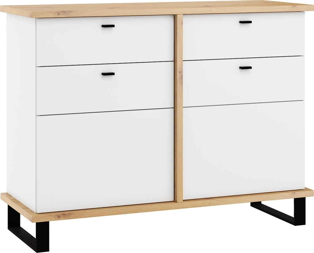 Komoda ze sektorové řady Komoda disponuje 2 skříňkami s plnými dvířky, s poličkou uvnitř každé z nich. Navíc má také 2 praktické zásuvky. Skříňky i zásuvky jsou vybaveny systémem tichého dovírání. Rozměry (šxvxh): 120 x 91 x 45 cm Barva: dub artisan/bílá Materiál: lamino tloušťky 16 a 25 mm s ABS hranami Materiál nožek: černý kov - výška 12 cm Úchyty: černá barva Dodáváno v demontu