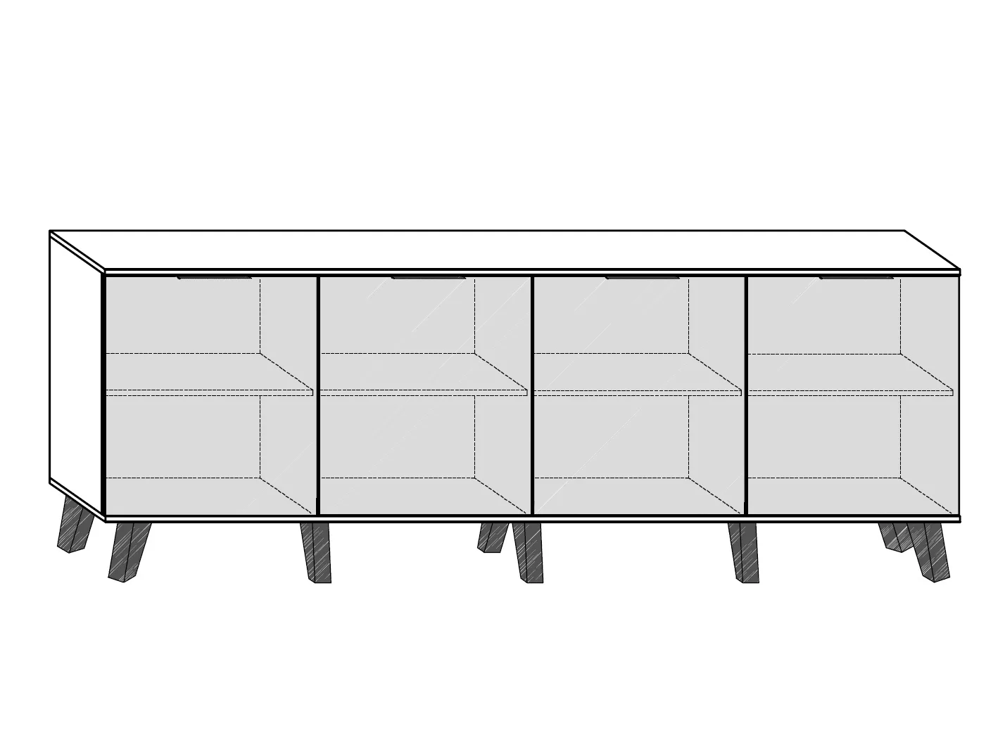 Komoda se čtyřmi dvířky Barva: - dub burgundský/bílý lesk - úchyty a nožky: černá Rozměr (šxvxh): 240 x 89 x 40 cm Výška nožek: 18 cm Materiál: - lamino o síle 16 mm s ABS hranami - dřevěné nožky Skříňky