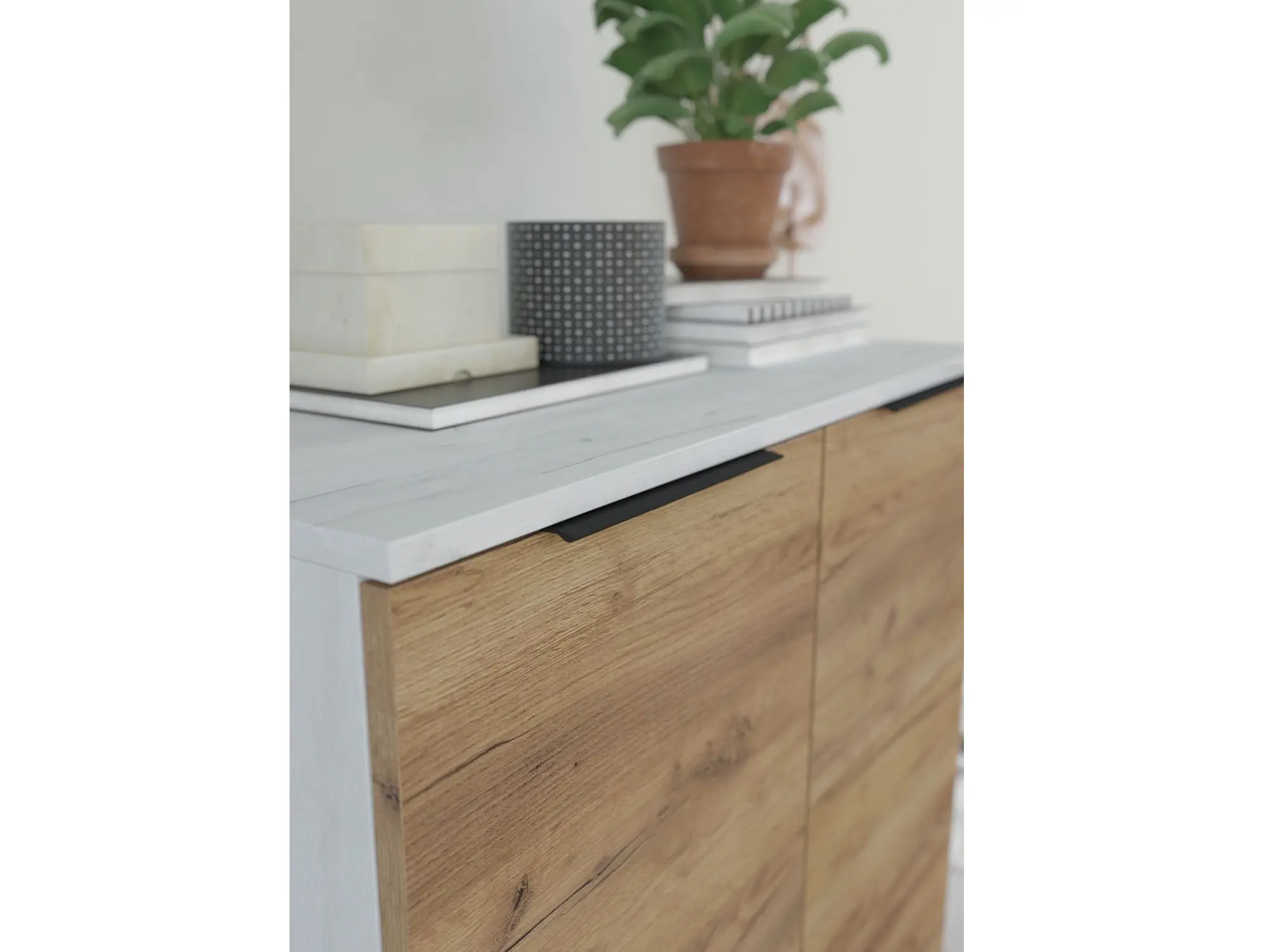 Komoda se čtyřmi dvířky Barva: - craft bílý/craft zlatý - úchyty a nožky: černá Rozměr (šxvxh): 240 x 89 x 40 cm Výška nožek: 18 cm Materiál: - lamino o síle 16 mm s ABS hranami - dřevěné nožky Skříňky