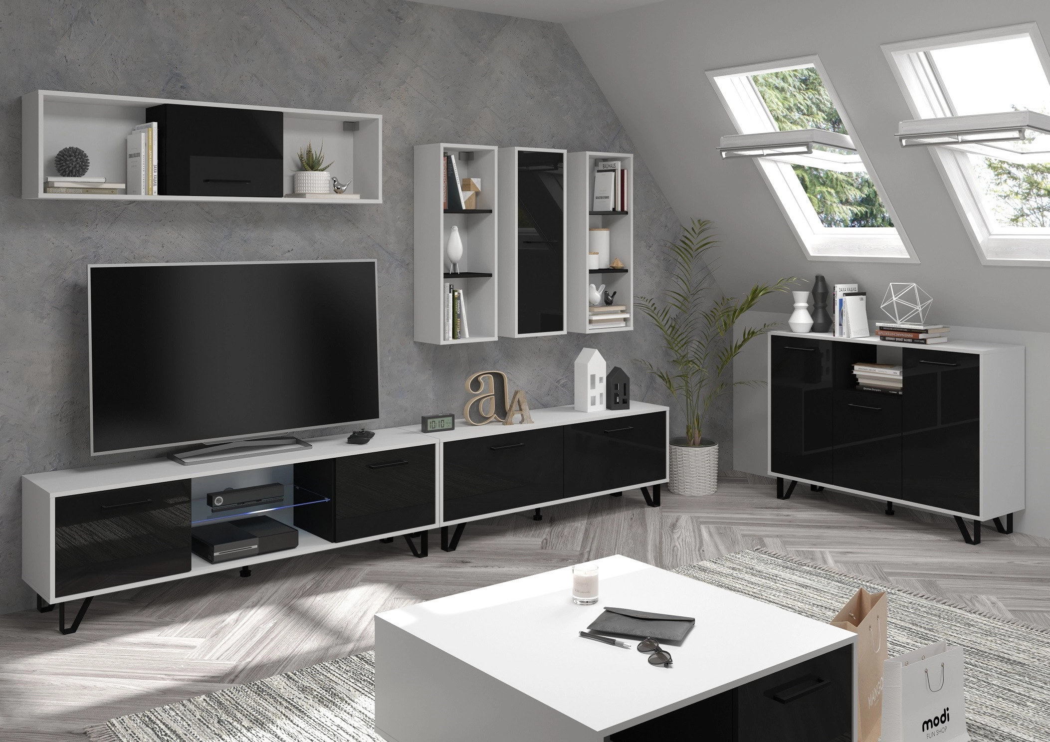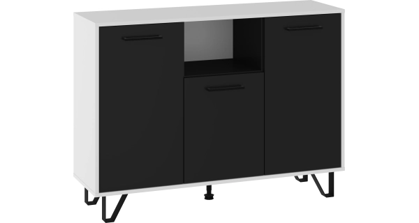 Policová komoda Barva: - bílá/černý lesk - nožky a úchytky: černá Rozměr (šxvxh): 120 x 87 x 39 cm Výška nožek: 12 cm Materiál: - lamino 16 mm, ABS hrany - nožky: kov Nosnost: - horní deska: max. 20 kg - police: max. 5 kg Disponuje systémem tichého dovírání.