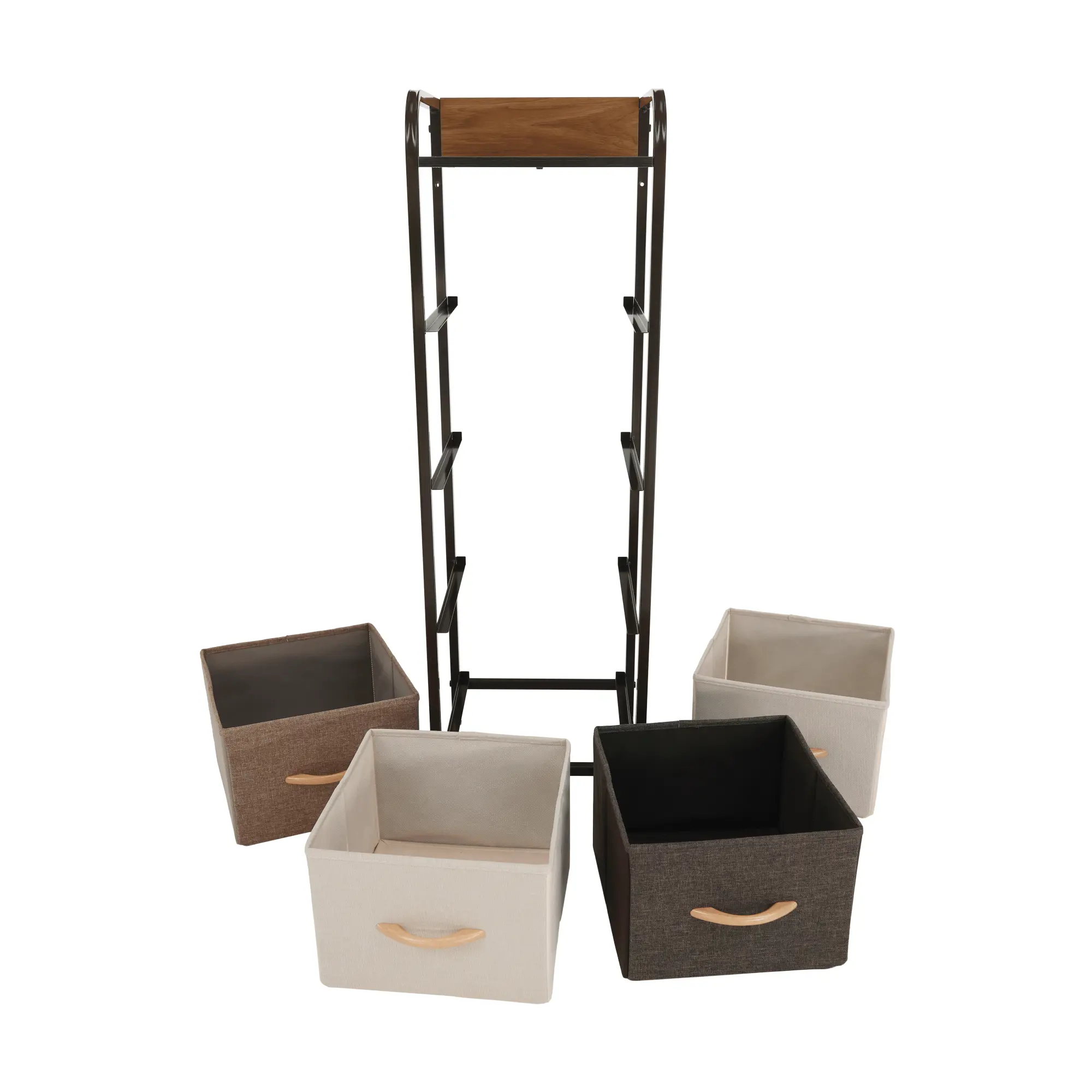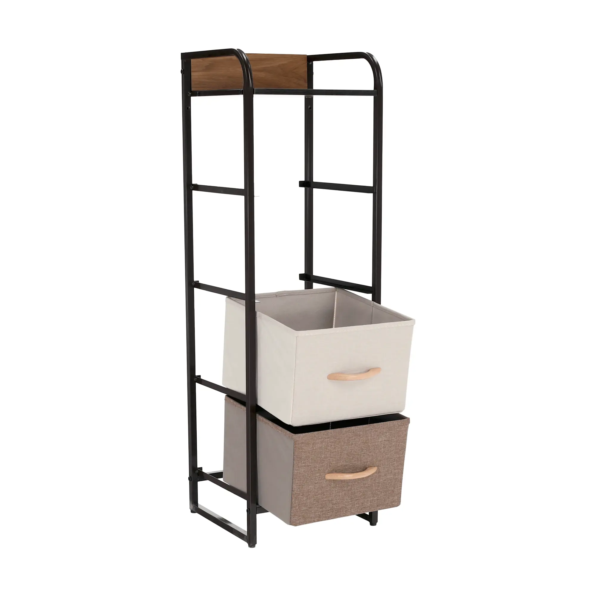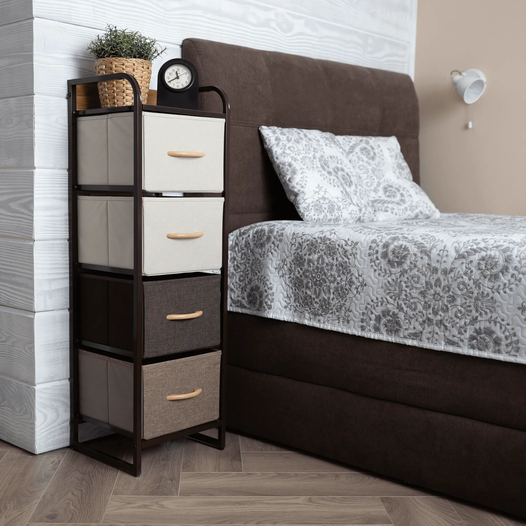 Komoda ZBYŠEK s látkovými šuplíky typ 1, černá/béžová/světlehnědá/tmavohnědá