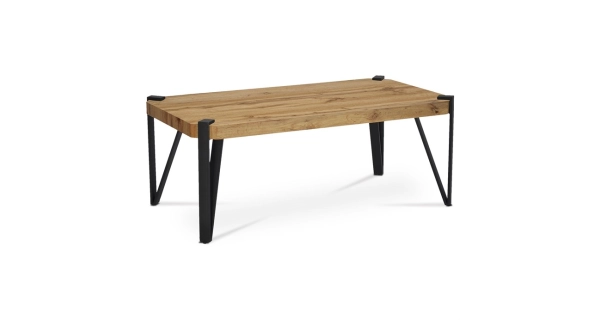 Konferenční stolek přinese do Vašeho domova trochu industriálního šarmu. Obdélníkovou desku z MDF v dekoru divoký dub harmonicky doplňují černé kovové nohy do tvaru V, plynule přecházející až na horní stranu desky. Stolek zaujme i svým nadčasovým designem.