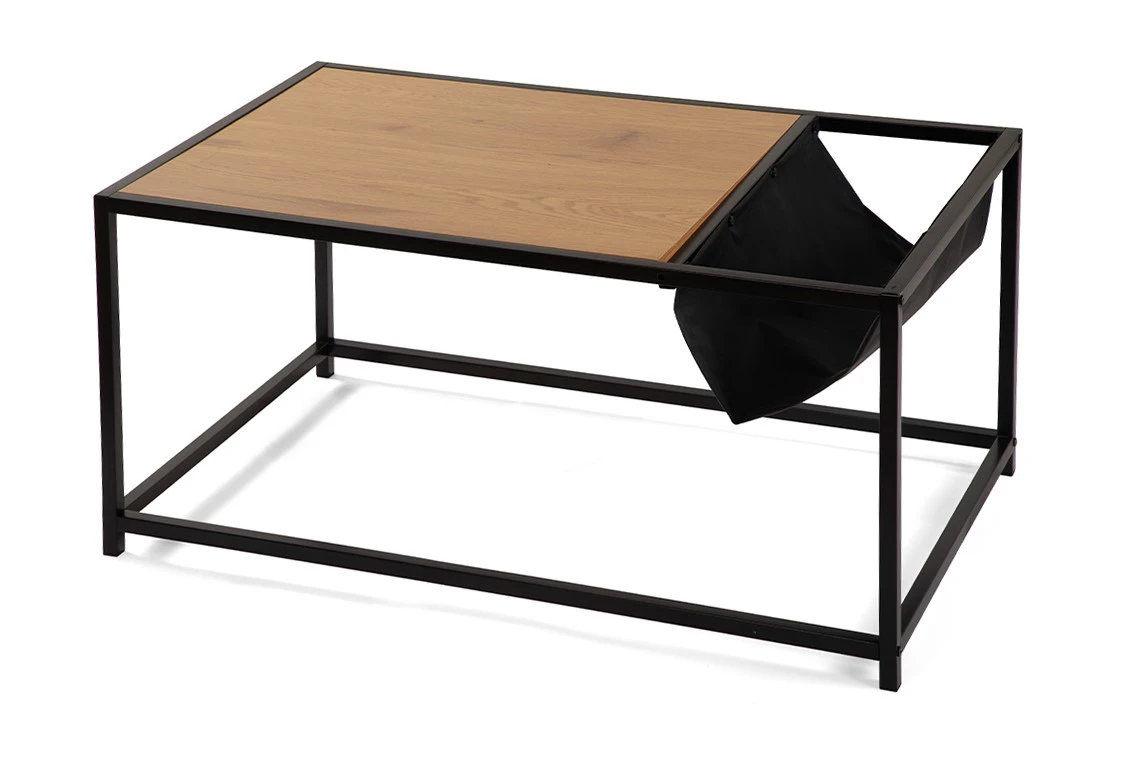 Moderní konferenční stolek s praktickým designem. Stolová deska v dekoru přírodního dřeva dodává elegantní vzhled. Stabilní kovová konstrukce v černém provedení. Integrovaný textilní úložný prostor ideální