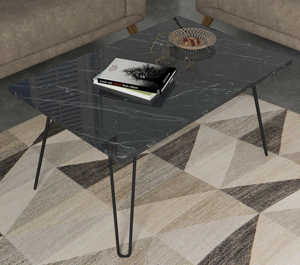 Konferenční stolek s kovovýma nožkama černé barvy, deska je vyrobena z kvalitního lamina o tl.18 mm hraněné PVC páskou, odolného proti poškrábání v barvě mramor černý.