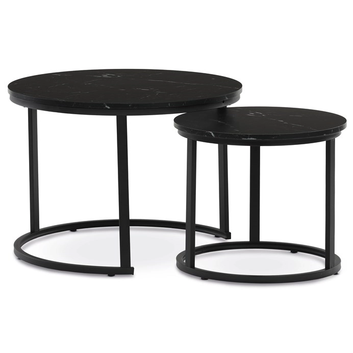 Sada dvou konferenčních stolků v industriálním stylu přinese do vašeho obývacího pokoje eleganci a praktičnost. Desky z MDF s dekorem černého mramoru v kombinaci s černými kovovými nohami vytvářejí stylový kontrast. Kruhový design a možnost menší stolek snadno umístit pod větší nabízí flexibilitu pro úsporu místa. Matný povrch desky je snadno udržovatelný a odolný vůči poškození. Tento set je ideální jak pro menší prostory, tak pro interiéry, kde vynikne svým moderním vzhledem a funkčním designem.