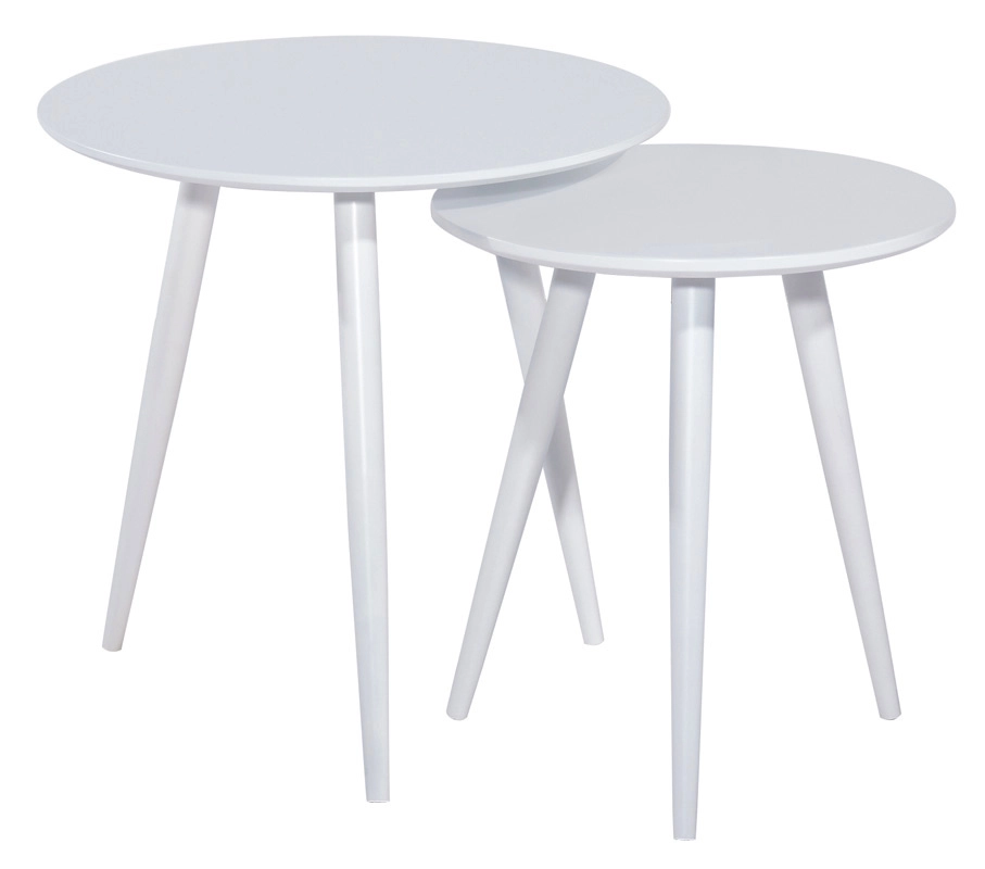 Konferenční stolky Sestava dvou kulatých konferenčních stolků. Vrchní deska je z kvalitní MDF, nohy stolku jsou z kovu. Stolky jsou v bílé barvě. MDF je mnohofoliová deska na kterou je vysokým tlakem nalisována PVC folie. Je stálobarevná, voděodolná a velice dobře se udržuje. Výška: 50 - 45 cm Šířka: 50 - 40 cm Hloubka: 50 - 40 cm Barva: bílá Materiál: MDF, kov Dodáváno v demontu, záruka 24 měsíců.
