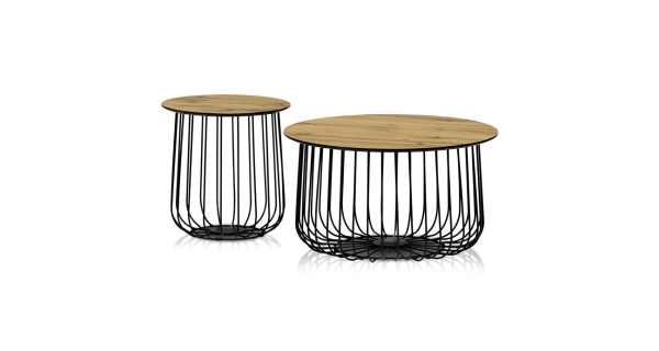 Set 2 ks stolků - stolky jsou v lehkém minimalistickém designu ve velmi oblíbeném industriálním stylu. Barva: 3D dekor divoký dub/černá Materiál: kovová drátěná podnož v černém matu/MDF tloušťky 18 mm Rozměr (průměr x výška): 60 x 34 cm, 37 x 37 cm Nosnost stolků je do 30 kg každý.