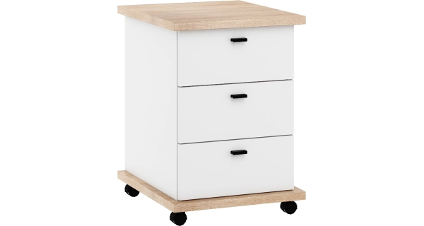 Kontejner ze sektorové řady Kontejner disponuje 3 zásuvkami. Rozměry (šxvxh): 43 x 61 x 50 cm Barva: dub sonoma/bílá Materiál: lamino tloušťky 16 a 25 mm s ABS hranami Materiál nožek: plastová kolečka - výška 5 cm Úchyty: černá barva Dodáváno v demontu