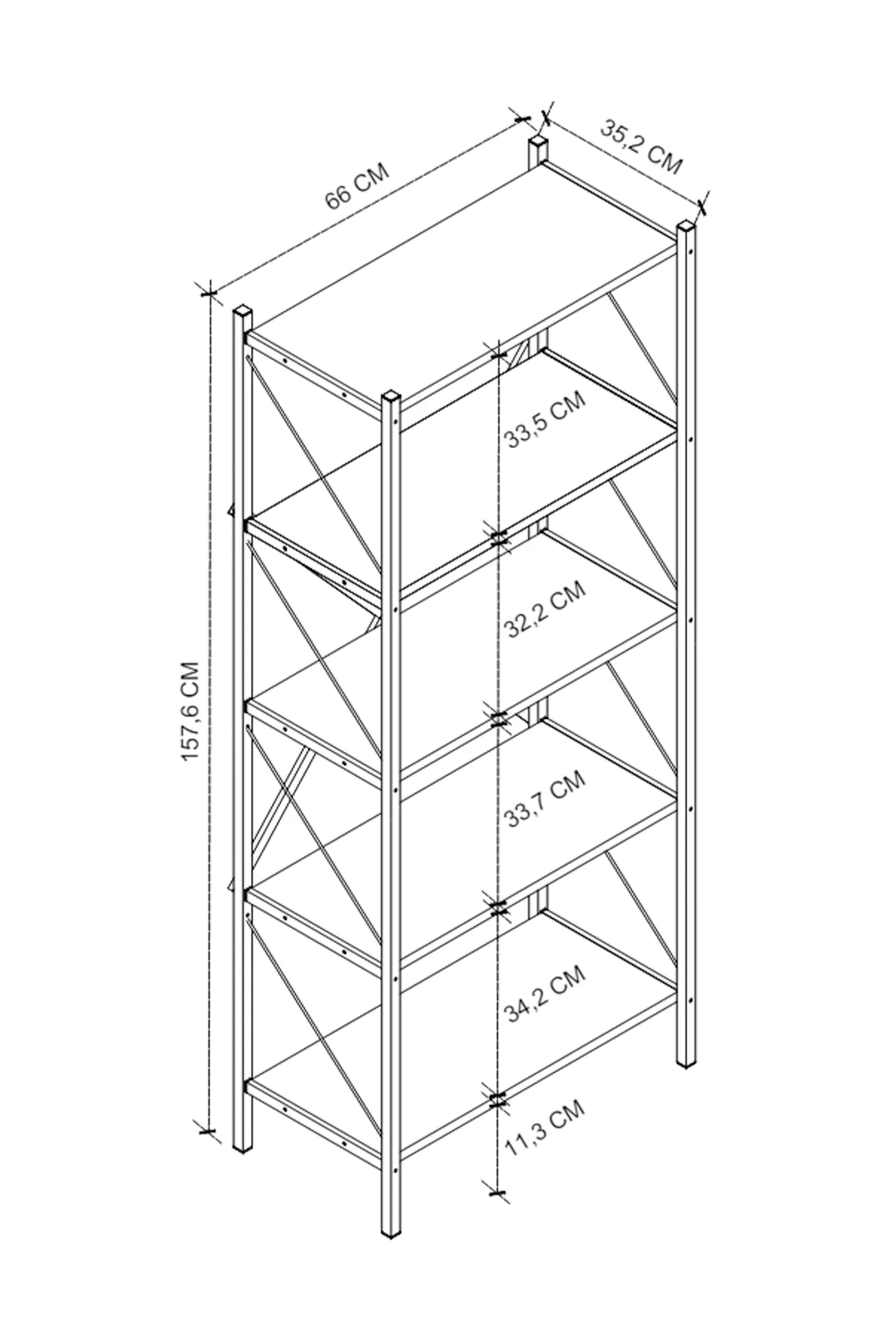Regál Rozměry (šířka x výška x hloubka): 66 x 157,6 x 35,2 cm Vzdálenost mezi policemi: 33,5 cm Materiál: kov, lamino 18 mm Barva: černá/mars Dodáváno v demontu.