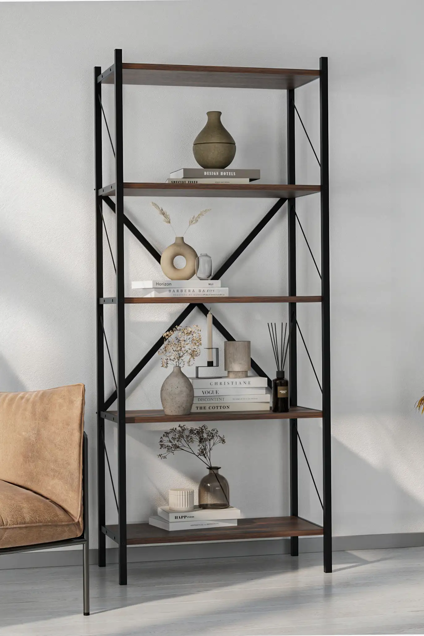 Regál Rozměry (šířka x výška x hloubka): 66 x 157,6 x 35,2 cm Vzdálenost mezi policemi: 33,5 cm Materiál: kov, lamino 18 mm Barva: černá/mars Dodáváno v demontu.