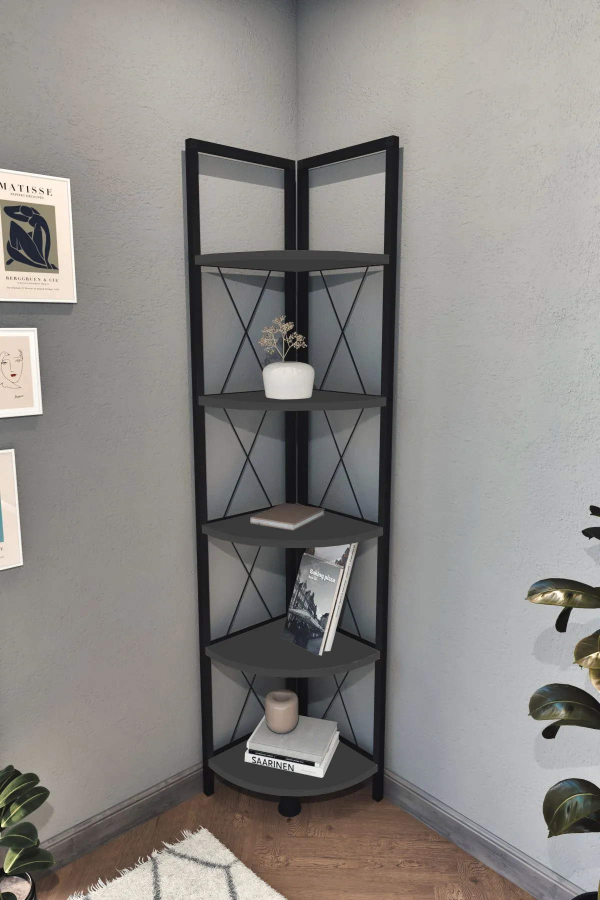 Rohový regál Rozměry (šířka x výška x hloubka): 33,5 x 159,5 x 33,5 cm Materiál: kov, lamino 18 mm Barva: černá/antracit Dodáváno v demontu.