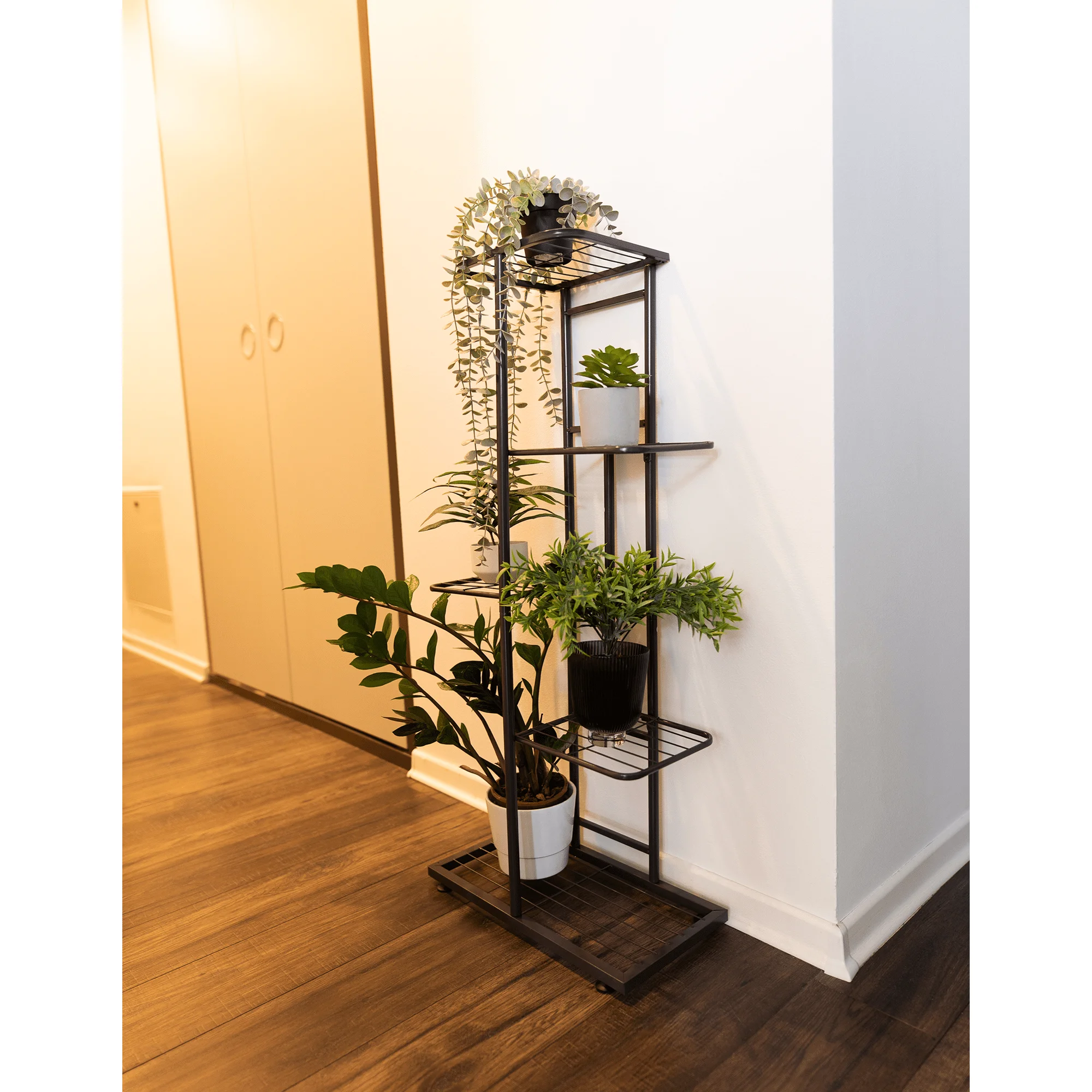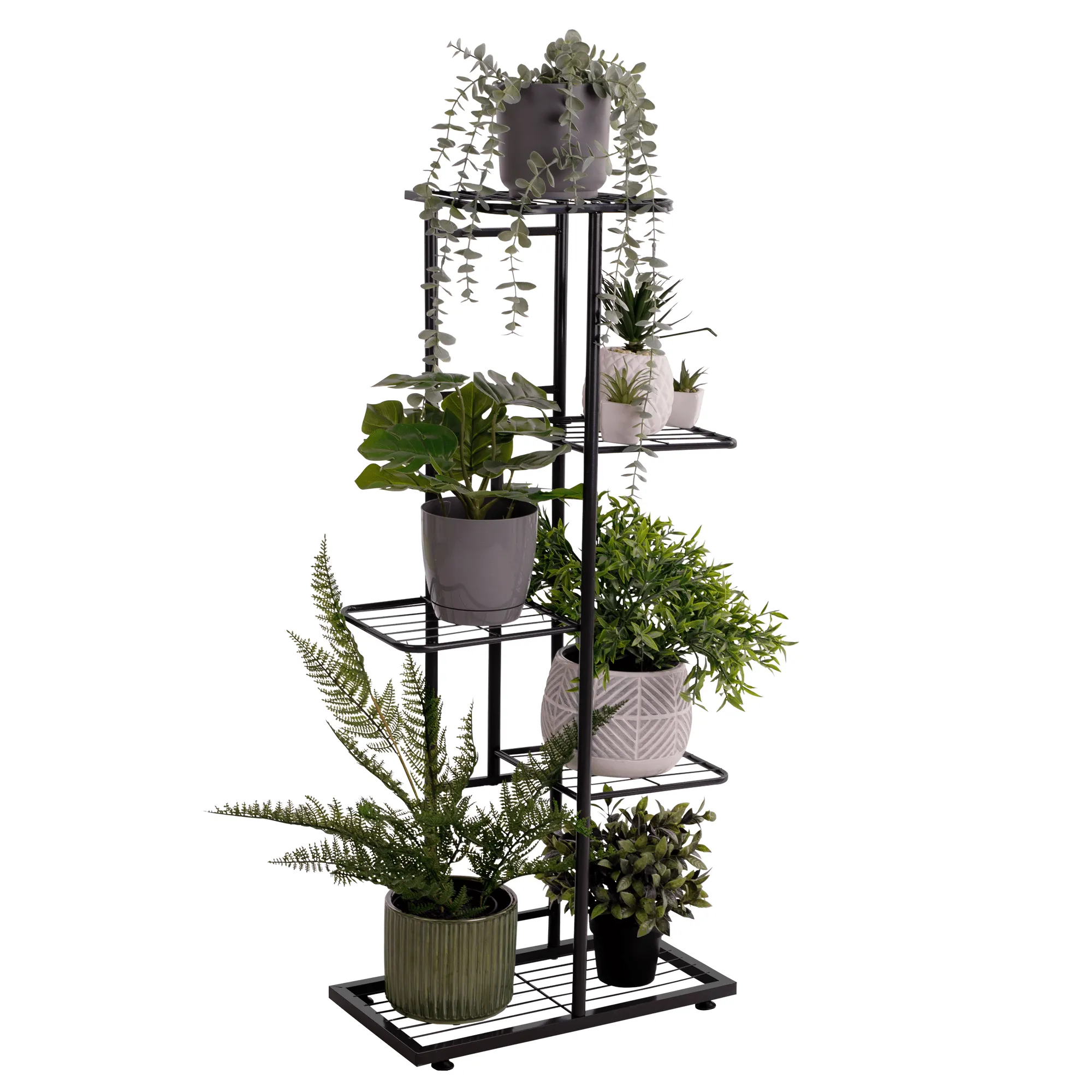 Stojan na květiny Barva: tmavě šedá Materiál: kov Rozměry (šířka x výška x hloubka): 43 x 98 x 22 cm Nosnost na jednu polici: 2 kg Tloušťka tyče: 1,6 cm Nohy zakončené ohebnými kluzáky na vyrovnání