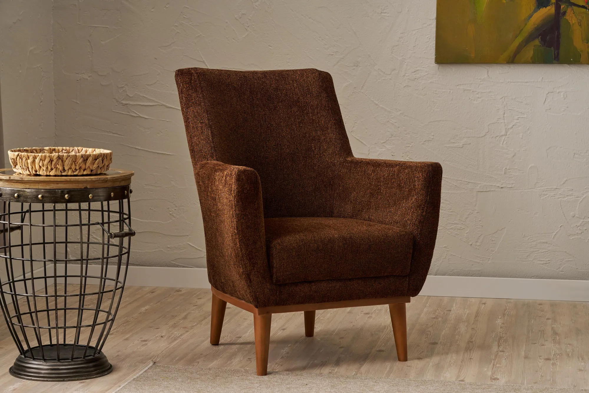 Naše křídlové křeslo, vyrobené z robustního rámu z habrového dřeva a čalouněné látkou se strukturou 100% polyesterového šenilu, je vyrobeno tak, aby vydrželo. Sytá hnědá barva dodá každé místnosti teplo a sofistikovanost, zatímco habrové nohy zajišťují stabilitu a styl. Ať už jej umístíte do obývacího pokoje, ložnice nebo domácí kanceláře, toto křeslo se jistě stane ústředním bodem vašeho interiéru.