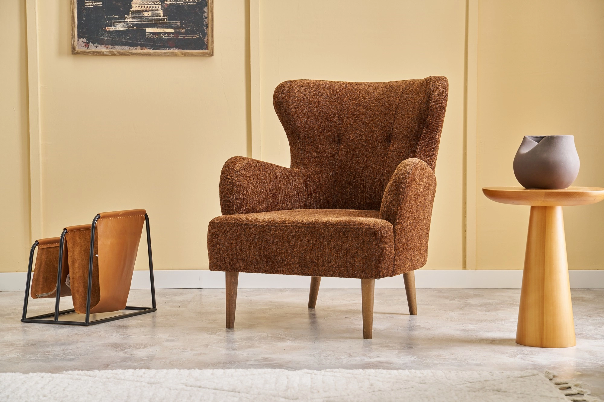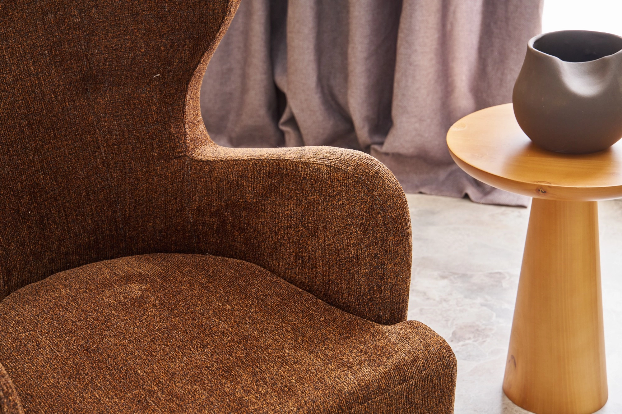 Dopřejte si luxus a pohodlí s naším nádherným křídlovým křeslem. Tento úžasný kousek není jen židlí, je to prohlášení elegance a sofistikovanosti. Syté hnědé a měděné barvy tkané žinylkové látky dodají teplo a styl každé místnosti.