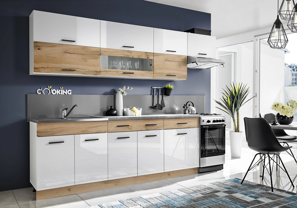 Tato kuchyně je navržena tak, že skříňky se dají poskládat v libovolném pořadí. To vám umožní si sestavit kuchyni podle svých představ. Korpus je v bílé barvě, sokl a části dvířek v barvě dub wotan. Ostatní část dvířek je v bílém lesku.