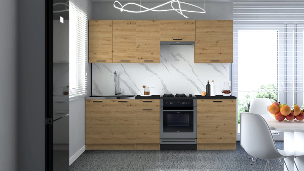 Kuchyňská sestava - dolní řada: 180 cm - horní řada: 240 cm Barva: - korpus: artisan - dvířka: artisan - úchyt: černá Materiál: lamino 16 mm Rozměry: - dolní skříňky: výška 82 cm, hloubka