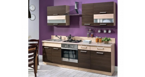 Součástí kuchyně je pracovní deska o délce 240 cm v barvě travertyn světlý, hloubka 60 cm, výška 38 mm Materiál LTD, ABS hrana 2 mm. Kovové pojezdy METALBOX v zásuvkách Plynové písty ve skříňkách s výklopnými dvířky. Dřez, spotřebiče a panel k pracovní desce není v ceně.