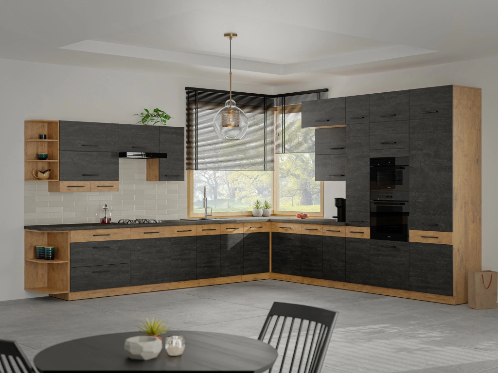 Rohová kuchyně ZEATA 330 x 340 cm, korpus: dub lancelot, dvířka: dark wood/dub lancelot