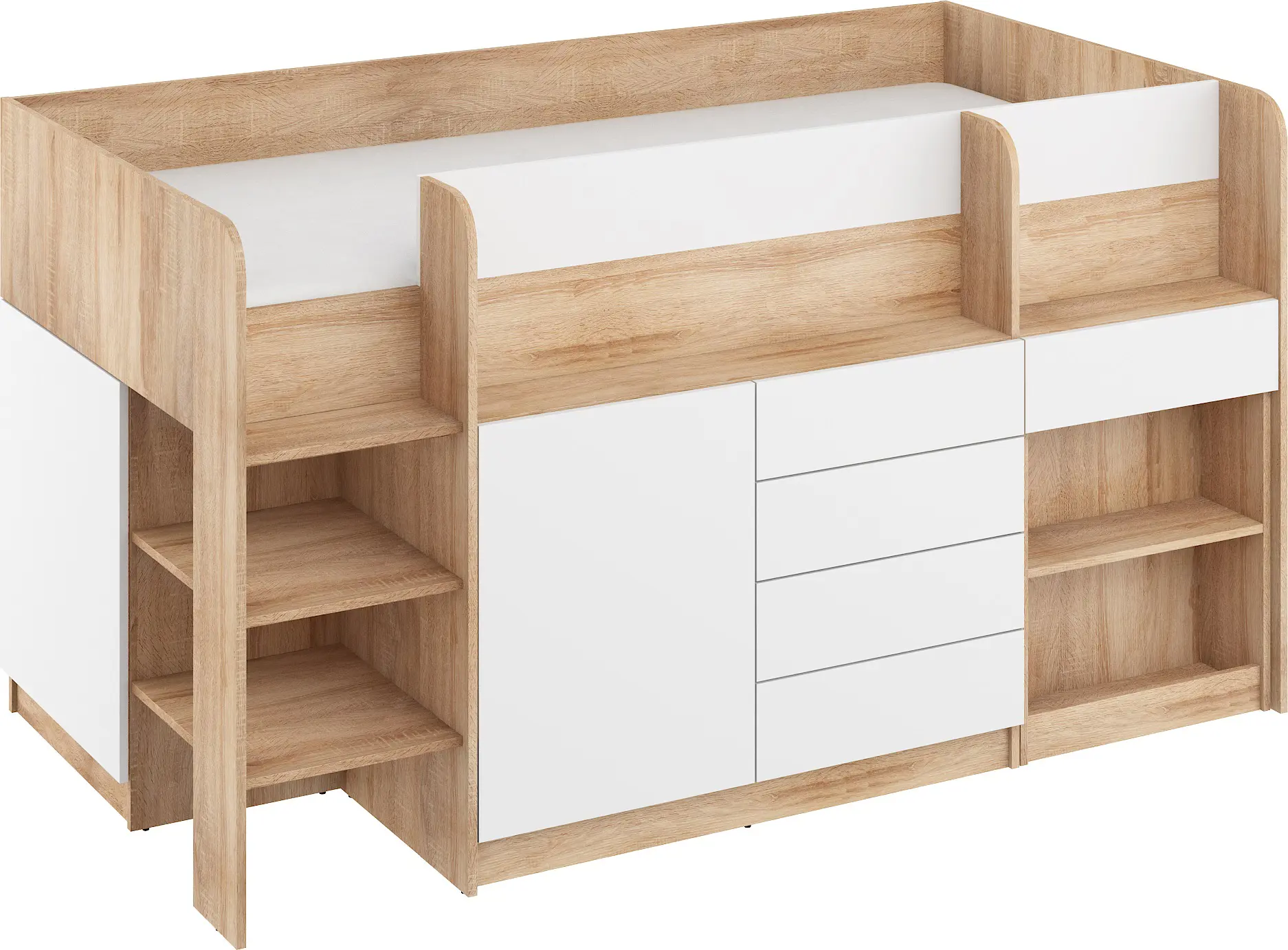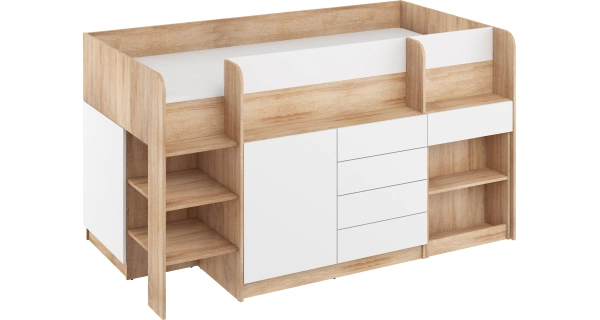Multifunkční patrová postel, levá (schůdky na levé straně)Postel je šikovným řešením do malých interiérů. Předností postele je spací prostor a zároveň dostatek úložného prostoru, aniž by zabírala mnoho